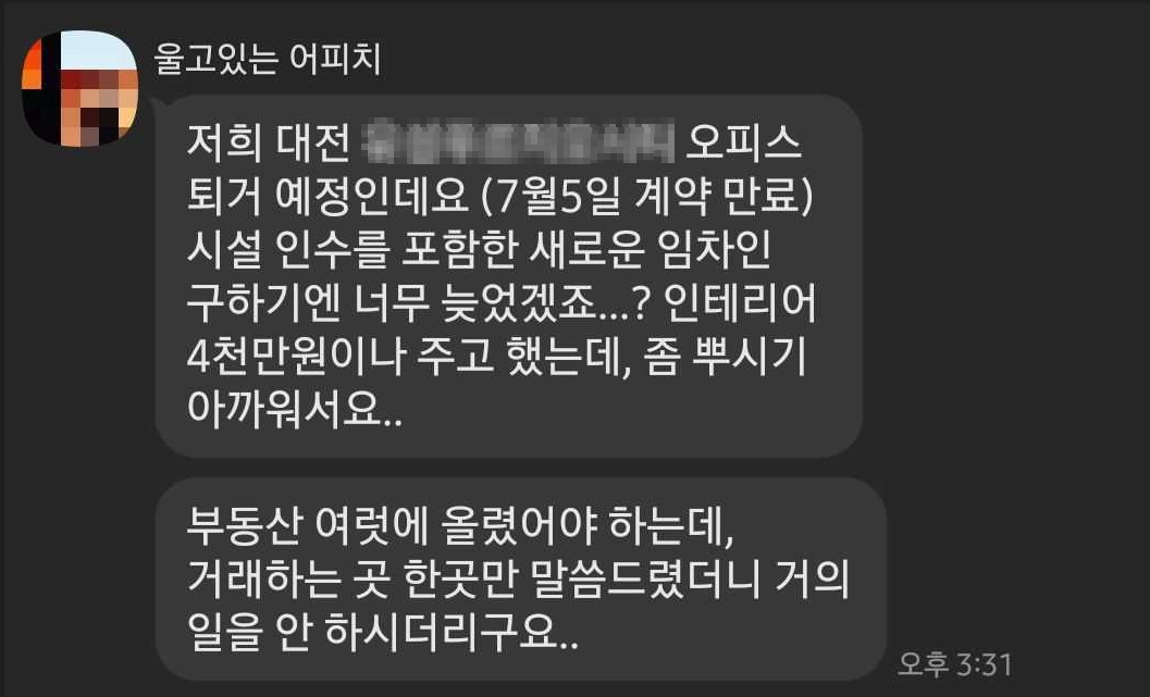 서울로 사무실을 이전하시면서 새 사무실 계약에 집중하시다보니, 기존 사무실 계약 만료 불과 3주 전에 처음 연락을 주셨어요. (매우 급한 일정도 이제 익숙합니다. 적응 완료😎) 근처 부동산 1곳에 내놓으셨는데 부동산에서 전혀 손님을 연결해주지 못했다고하셨어요.